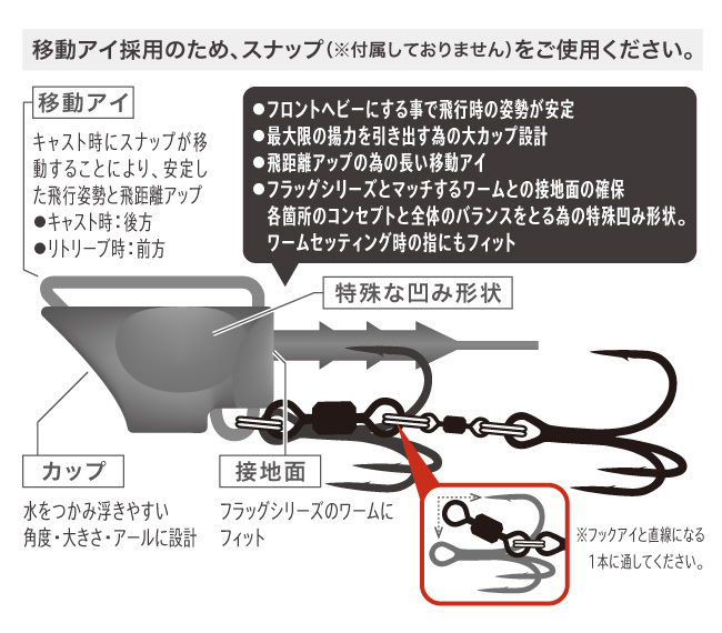 フラットゲームのワーミングにおいて最も重要なのが、スピード&レンジコントロールだ。シャローサーフに関して言えば、浅さ故に底から浮き上がらせるには速く巻く必要があった。しかし99ヘッドは前部をカップ形状にする事で揚力を発生させ、素早く底離れする事を実現させた。『遠くへ飛ばしたい』『もう少しゆっくり巻きたい』そんなアングラーの想いを実現させたのがこの99ヘッドだ。