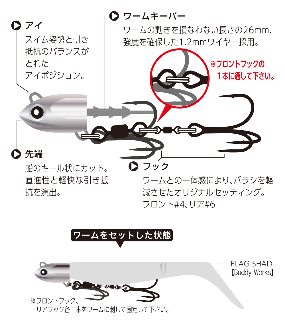 タダ巻き、ストップ&ゴーでテストを繰り返しされたリトリーブ用ヘッド。船のキール状の先端形状とアイポジションにより、浮き上がりの早さと軽快な巻き心地を実現。ヘッドのフラットサイド部は、ロール時にヘッド単体でもフラッシングアピールします。フラッグシリーズのワームとのマッチング効果は抜群で、一体感を感じさせるデザインとなっています。