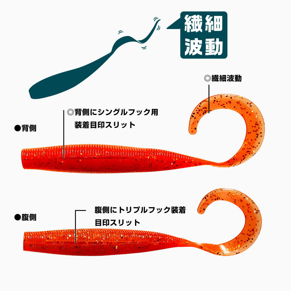 アピール力抜群のファットボディーと、細いカーリーテールが生み出す微波動のギャップが魅力。強波動では食わないシビアな状況下でもテールだけを『ピロピロ』とアクションさせ、警戒感なくバイトに持ち込む。カールの形状を敢えて長く且つ緩くする事で、スローから伸びた形で『ピロピロ』と軽快にアクションし、まるで小魚が油断して泳いでいるかのように演出してくれる。今までシビアな時に使うワームと言えばピンテール系のワームであったが、これによりまた新たな攻め方が可能となる。
