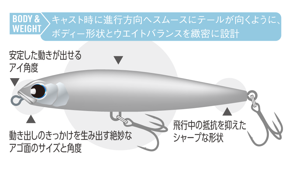 飛距離を追い求めた高比重ボディーと浮遊感という、相反する要素のバランスを追求したのがリックファイアです。ハンドルにトルクがかかった瞬間から動き出す程レスポンスが良く、リーリング感覚とアクションが一体となったような感覚で使用出来ます。シンキングペンシルは手元に感覚が伝わりにくい。だからこそイメージと一体感のあるリックファイアは信頼して使える武器となるのです。