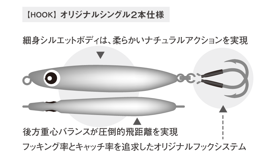 体高のある魚に比べ細身シルエットのベイトは捕食されやすい傾向にあり、これは自然の摂理であると考えられます。この細身のシルエットはアクションにも大きく影響します。鉛筆の先端を持って揺らした時を思い出して下さい。同様の症状がスリムピースにも起き、シルエットを細くする事で、生きたイワシのようなより柔らかいナチュラルな動きが可能となっています。また細身&後方重心のボディーは圧倒的な飛距離が出ることは言うまでもありません。