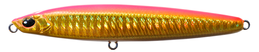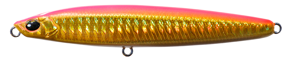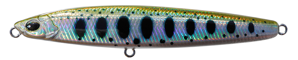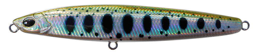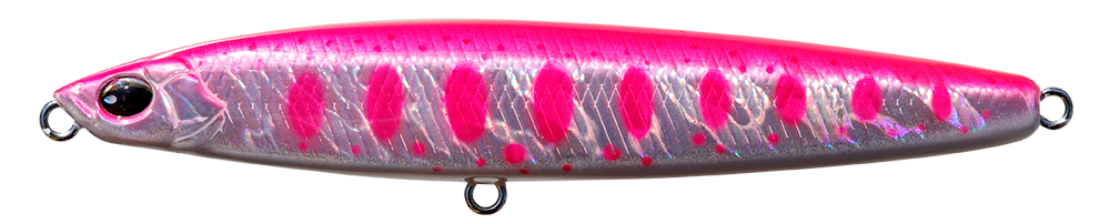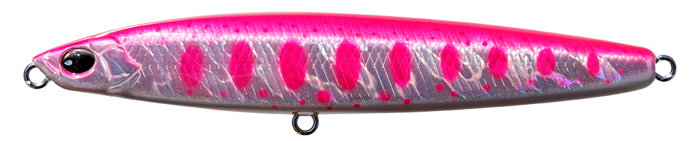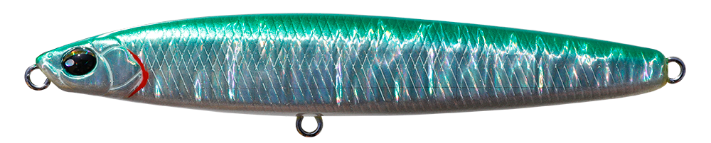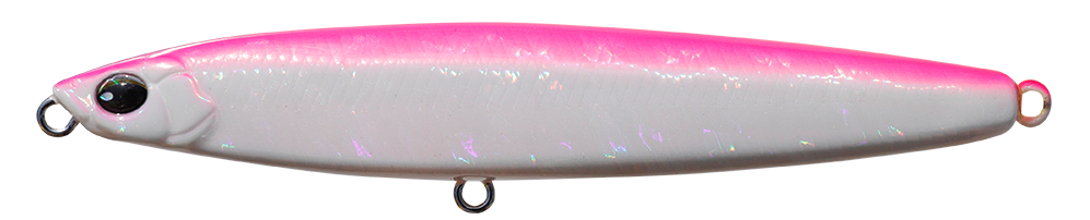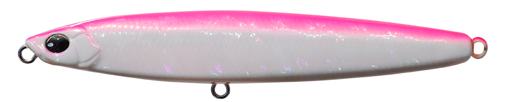 足場の高い磯や水深のある磯、波風があるラフコンディションのサーフなどに適しています。まずはなんと言っても抜群の飛距離。風をもろともしない飛距離は最大の魅力。水噛みも非常に良いので、98mm35gと高比重であるにも関わらず安定して泳いでくれます。ジャークもテストしており、ミノーで届かない距離でのジャーキングは唯一無二の攻め方です。このモデルのみ4:6のセンターバランス寄りの後方重心なので、フォールは少しテールを下げたバックスライドフォール。